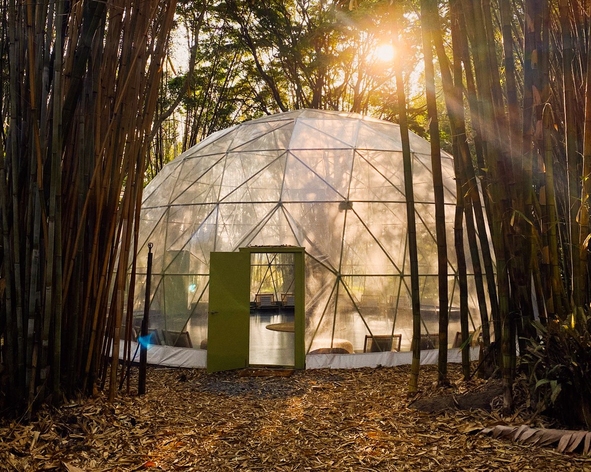 The sleek complex has a shared living area, a freshwater infinity pool, outdoor cinema, treatment rooms and a yoga dome set within the lush gardens.